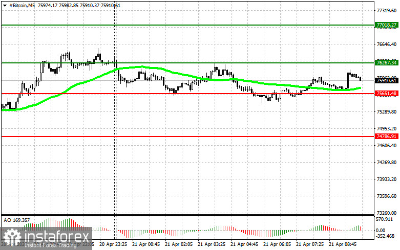 • Scenario No. 2: Bitcoin can also be bought from the lower boundary of $75,600 if there is no market reaction to its breakout back to levels $76,200 and $77,000.