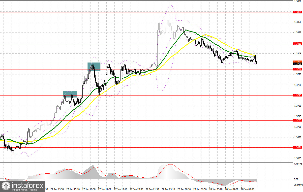 Вчера было образовано несколько точек входа в рынок. Давайте посмотрим на 5-минутный график и разберемся с тем, что там произошло. В своем утреннем прогнозе я обращал внимание на уровень 1.3676 и планировал от него принимать решения по входу в рынок. Снижение и формирование ложного пробоя в районе 1.3676 привели к точке входа на покупку фунта, что вылилось в рост пары на 20 пунктов. Во второй половине дня продажи от уровня 1.3782 привели к довольно крупному падению пары более чем на 40 пунктов.