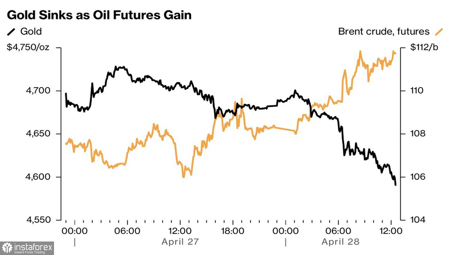 По данным Всемирного золотого совета, спрос на драгметалл в первом квартале достиг рекордных $193 млрд в стоимостном выражении и увеличился на 2% в физическом до 1231 т. Сырьевые рынки цикличны, рост цен приводит к снижению потребления. И первым отреагировало ювелирное дело, где спрос сократился на 23% до 300 т. Напротив, интерес к инвестициям вырос. И это обстоятельство до некоторых пор удерживало XAU/USD на плаву. Однако в преддверии оглашения результатов апрельского заседания FOMC золото рухнуло.