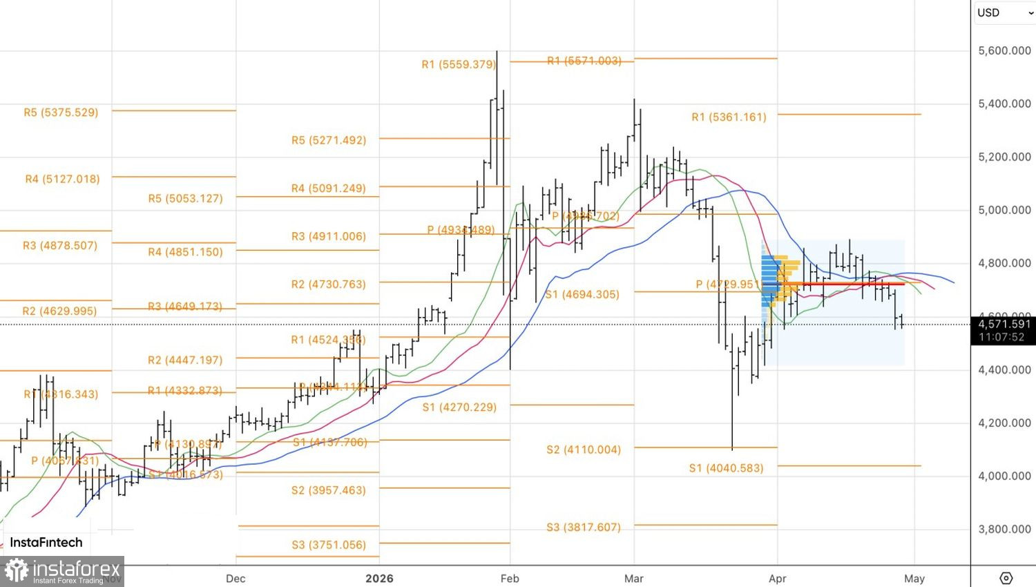 Технически на дневном графике золота имеет место отдаление котировок от скользящих средних и справедливой стоимости. Это свидетельствует об усилении позиций «медведей». Падение драгметалла ниже $4550, либо отбой от $4640 за унцию станут поводами для продаж.