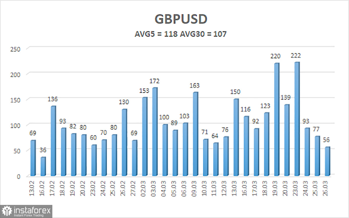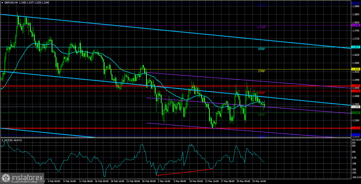 Средняя волатильность пары GBP/USD за последние 5 торговых дней составляет 118 пунктов. Для пары фунт/доллар это значение является «высоким». В пятницу, 27 марта, таким образом, мы ожидаем движения внутри диапазона, ограниченного уровнями 1,3221 и 1,3457. Старший канал линейной регрессии развернулся вниз, что указывает на смену тренда. Индикатор CCI заходил в область перепроданности дважды, а также сформировал «бычью» дивергенцию, что еще раз предупредило о завершении нисходящей тенденции. Но геополитика сейчас важнее технических сигналов.