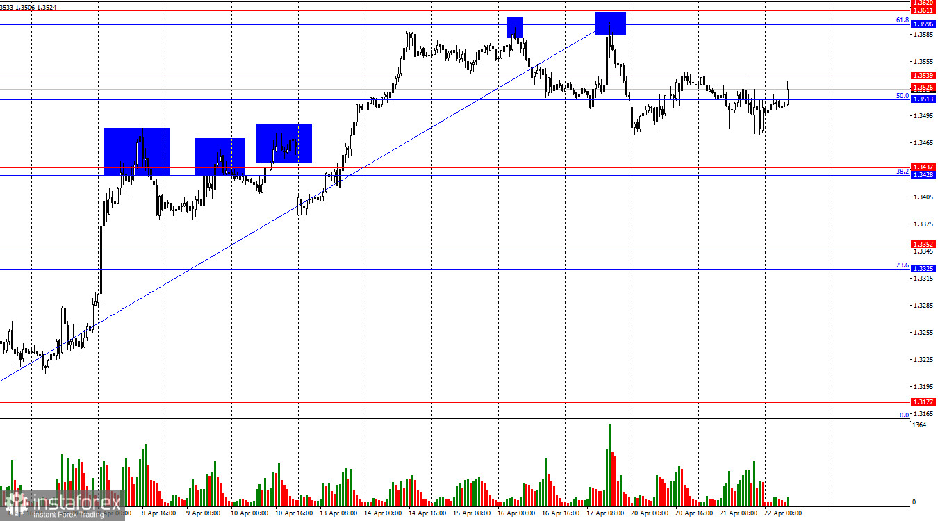 Информационный фон во вторник был очень интересным, но трейдеры предпочли сохранять спокойствие. На мой взгляд, ключевым событием дня стал очередной отказ Ирана от переговоров с США, однако также в Великобритании вышел весьма позитивный уровень безработицы, а в США – обнадеживающие розничные продажи. Однако в течение дня ни быки, ни медведи не посчитали нужным переходить в атаку. Активность трейдеров была слабая. Сегодня утром в Великобритании вышел отчет по инфляции за март. Напомню, что именно в марте началась полномасштабная война на Ближнем Востоке, а цены на энергоносители взлетели в космос. Поэтому многие, включая Банк Англии, ожидали резкого ускорения инфляции, однако мартовский отчет показал умеренное повышение индекса потребительских цен – до 3,3% г/г, в рамках ожиданий рынка. Базовая инфляция снизилась до 3,1% г/г, хотя трейдеры ожидали значения 3,2%. Могу сказать, что значения отчета не удивили трейдеров, поэтому реакция практически отсутствовала. Помимо этого, трейдеры сейчас не горят желанием активно торговать, ожидая развития событий на Ближнем Востоке. Дональд Трамп вчера продлил перемирие с Ираном, но когда состоится новый раунд переговоров – неизвестно.