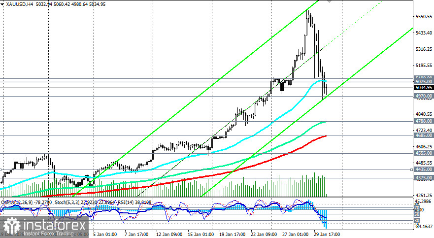 Продолжение коррекции. Пробой уровня 5000.00 может открыть путь к более глубокому падению в зону 4800.00 – 4685.00 (ЕМА200 на 4-часовом графике) для тестирования следующих уровней поддержки. Это вероятно при дальнейшем укреплении доллара и появлении новых «ястребиных» сигналов от ФРС.