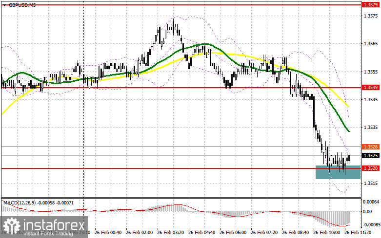 Заявления представителя Банка Англии, ожидаемо, привели к снижению британского фунта, так как сейчас все больше ведется разговоров о необходимости дальнейшего снижения ставок в Великобритании. Во второй половине дня фунт может отреагировать падением и на хорошие данные по сокращению числа первичных обращений за пособием по безработице, а также на ястребиный тон члена FOMC Мишель Боуман, которая выступает за более длительную паузу в цикле снижения ставок в США. В случае медвежьей реакции фунта на все вышесказанное, только формирование ложного пробоя в районе 1.3520 по аналогии с тем, что я разбирал выше, даст точку входа в длинные позиции в расчете на восстановление к уровню 1.3549. Прорыв с обратным тестом сверху вниз этого диапазона приведут уже к новой точке входа в длинные позиции с перспективой выхода на 1.3579. Самой дальней целью окажется область 1.3603, где собираюсь фиксировать прибыль. При сценарии снижения GBP/USD и отсутствия активности со стороны быков на уровне 1.3520, давление на пару существенно возрастёт, что приведет к возврату в рамки бокового канала, чего покупателям никак допускать нельзя. В таком случае лишь формирование ложного пробоя в районе 1.3492 будет подходящим условием на открытие длинных позиций. Покупать GBP/USD сразу на отскок собираюсь от поддержки 1.3462 с целью коррекции в 30-35 пунктов внутри дня.