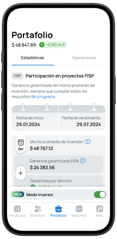 FISP investments are designed for a 6-month term. During the first 6 months of trading, the guaranteed profit is at least 50% of the invested funds. After the first 6 months, the program can be extended for another 6-month period, during which the guaranteed return will be 15%.