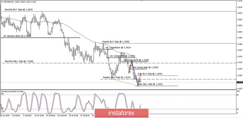 14.08.2020 10:50 PMEn el gráfico de 4 horas, detectamos la divergencia entre el precio y el oscilador estocástico. Esto indica un retroceso alcista del USD/CAD que interrumpirá la tendencia bajista. El retroceso podría ocurrir después de que el loonie rompa la estructura del mercado primero en 1.3191 antes que el precio suba para un retroceso. Preste atención al nivel de 1.3338 si el par lo pasa. Entonces, podríamos detectar señales de que la tendencia bajista del USD/CAD cambiará.