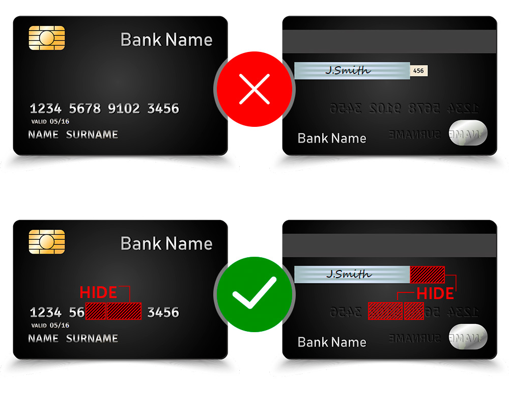 The photo of the bank card is uploaded to your Client Area, and only you have access to it. In the Client Area, confidential information is transmitted via a secure connection and stored on protected servers. This way, we ensure the safety of your bank card data and protect it from unauthorized access. In addition, we ask all our clients to hide sensitive data before sending us a bank card photo. We only need to see the first 6 and last 4 digits of the card number, the validity, and the owner’s signature. The CVС2/CVV2 code should be covered up. This extra measure will protect your bank card data from malicious and unauthorized use.