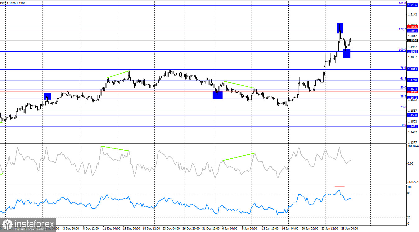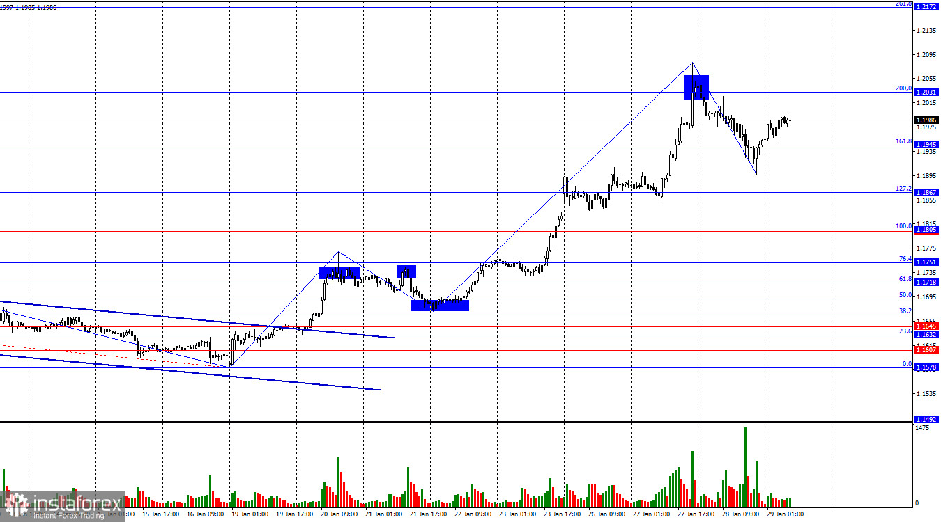 Сетки уровней Фибоначчи построены по 1,1805–1,1578 на часовом графике и по 1,1918–1,1471 на 4-часовом.